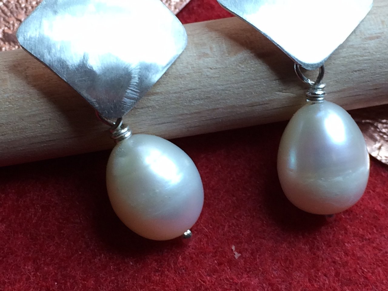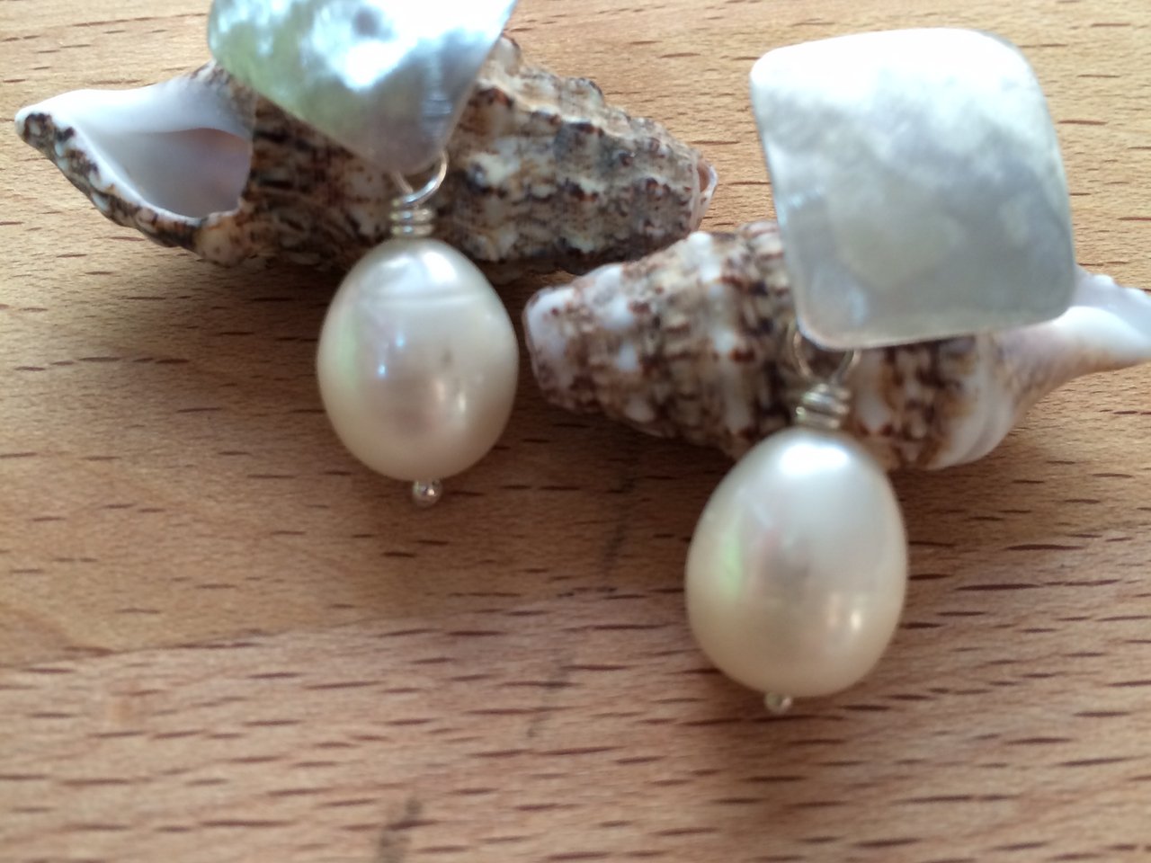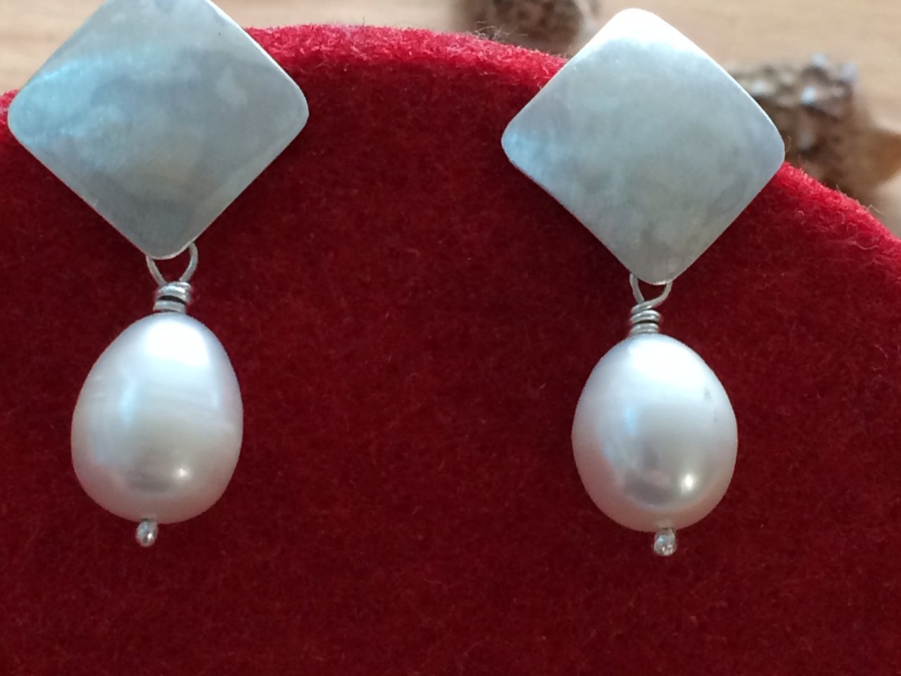 Ohrringe aus einer 925 Silberplatte, hier ist eine Süßwasser Perle angehängt.