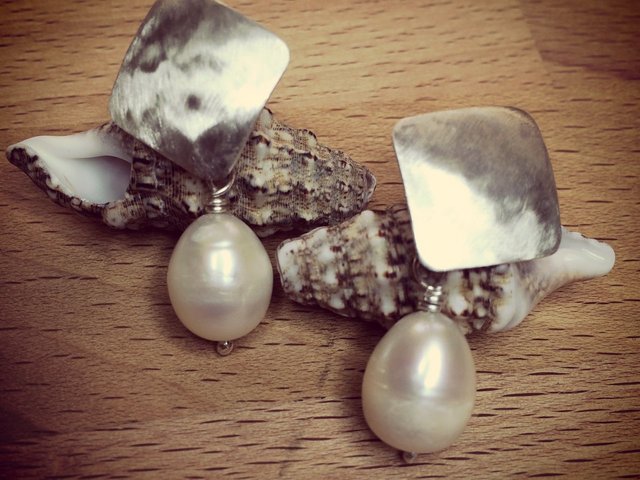 Ohrringe aus einer 925 Silberplatte, hier ist eine Süßwasser Perle angehängt.